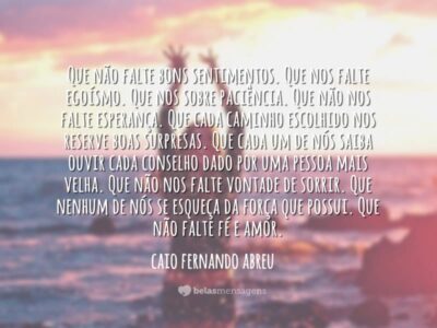 Que não falte bons sentimentos. Que nos falte egoísmo. Que nos sobre paciência. Que não nos falte esperança. Que cada caminho escolhido nos reserve boas surpresas. Que cada um de nós saiba ouvir cada conselho dado por uma pessoa mais velha. Que não nos falte vontade de sorrir. Que nenhum de nós se esqueça da força que possui. Que não falte fé e amor. Via Belas Frases de Amor. Caio Fernando Abreu